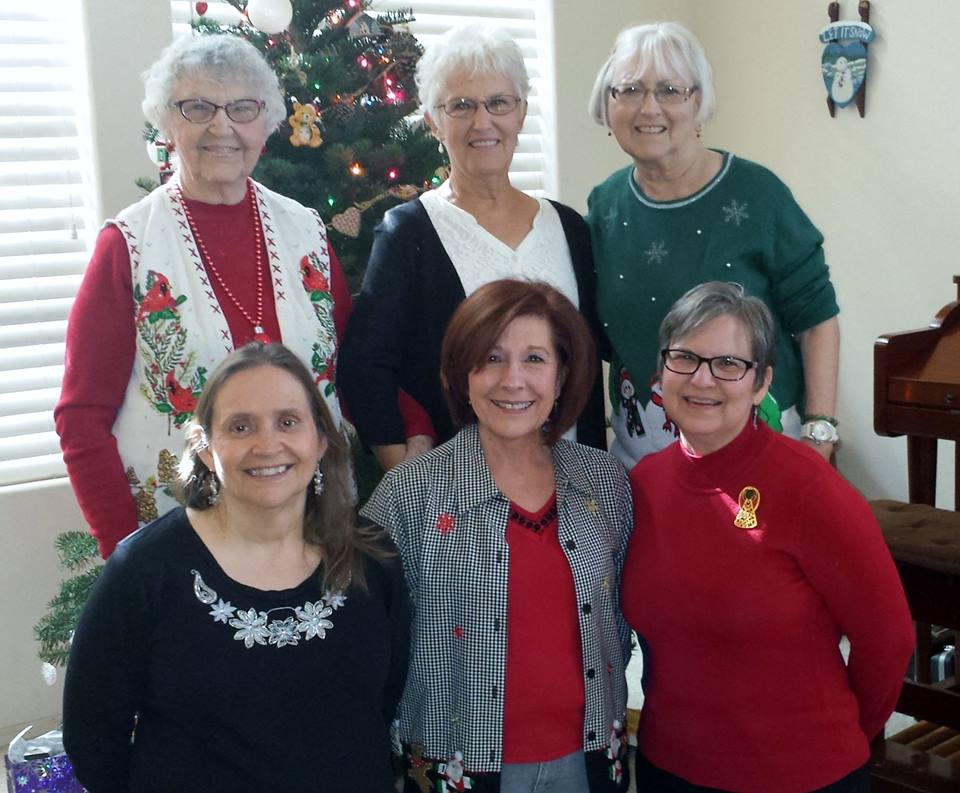 Most of our group at Christmas, 2014. Back row: Donna, Judy, Betty. Front row: Andrea, Peggy, and Linda