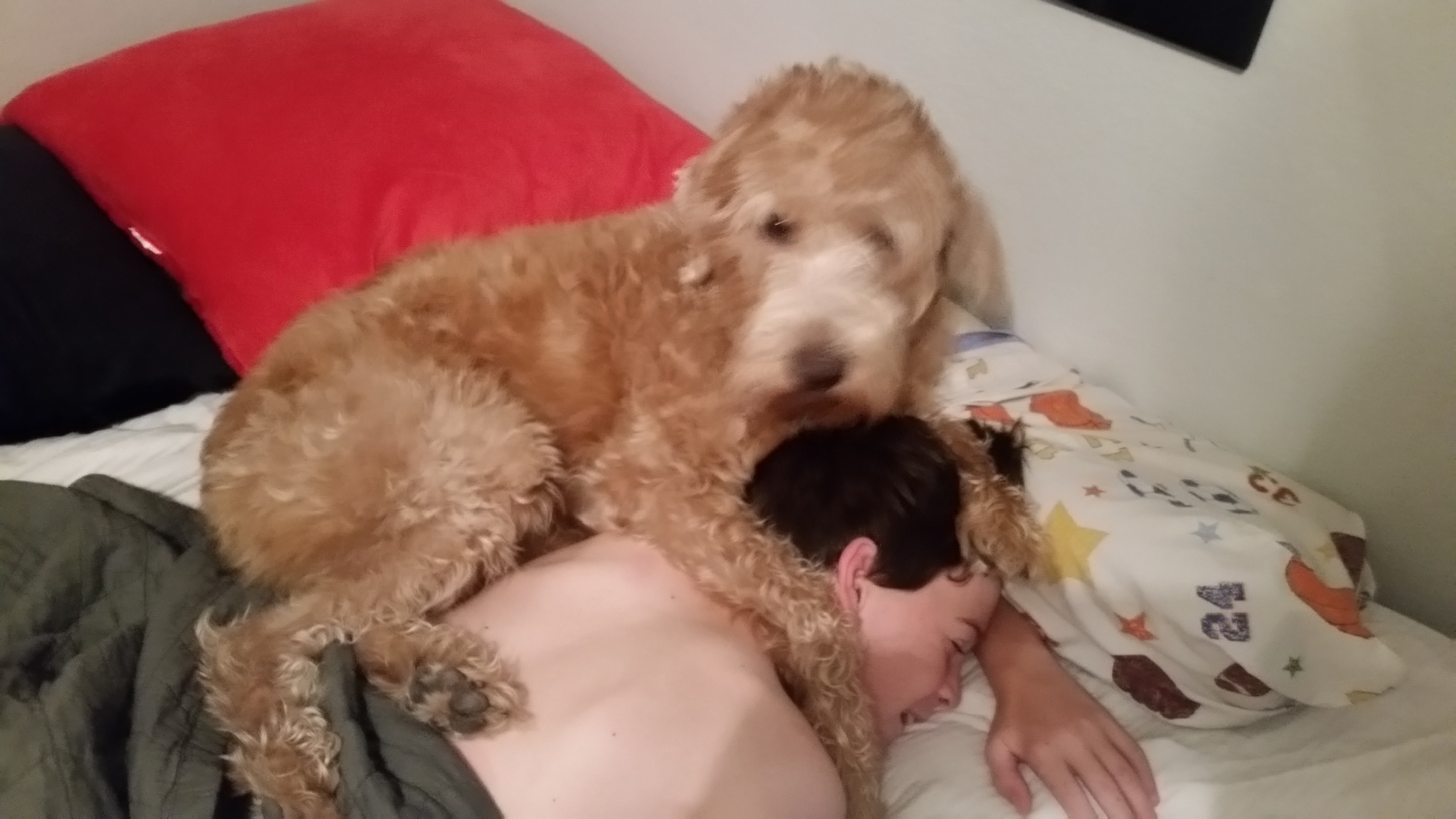 I love to stare at this photo of my grandson, Preston, and the family dog, Ella, who sleeps with him each night. Like most dogs, she’s a goofy friend whose energetic play brings smiles and laughter to all of us. Who can be sad around golden-doodle Ella?