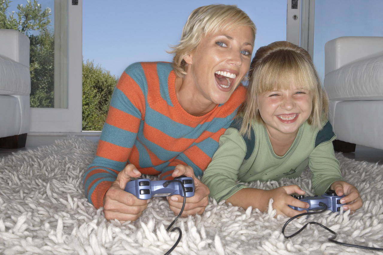 Mother and Daughter Enjoying a Video Game — Image by © Royalty-Free/Corbis