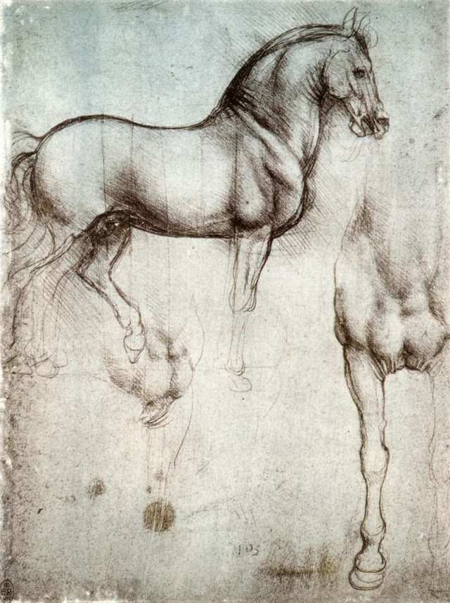 Sadly, the horse project was never completed. In 1494 the French attacked the Italian states, and the bronze for the statue was repurposed to make cannons. When the French invaded Milan, their archers used the clay model of the horse for target practice, destroying it. Only his notes remain to show how much time, energy, and love he devoted to the project. (More modern artisans eventually made a statue from Leonardo’s plans.)